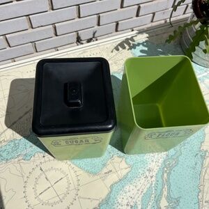 Vintage 70s Beacon sugar and flour avocado green plastic canister set. Missing one lid, otherwise in very good condition. Each measures 8" tall, 6" deep, 5.5" wide.