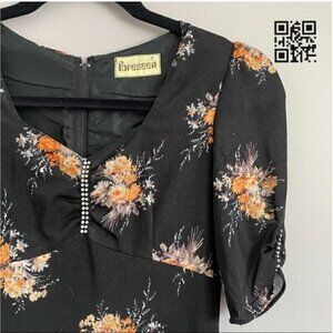 Sweetheart neckline, rhinestone appliqué at chest and on the puffy, short/half sleeves. Fit 'n flare style! Vintage, most likely from the 70s.