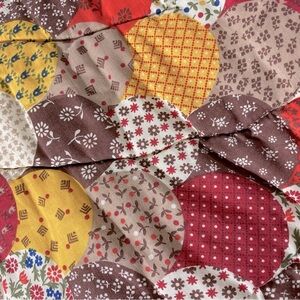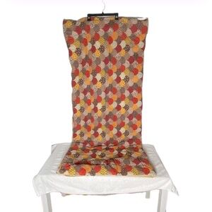 Vibrant vintage sleeping bag with a multicolor pattern. Features shades of brown, orange, and yellow.