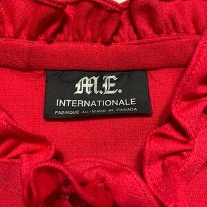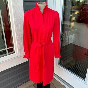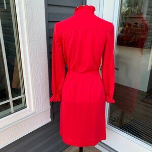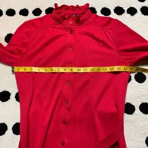 This vintage 70s Secretary Dress is a stylish and unique piece perfect for retro fashion enthusiasts. The dress features a tie front button closure, long sleeves, and a button ruffle neckline, giving it a classic yet modest style. Made from chiffon jersey material in a vibrant crimson pink red color, this S/M sized dress has a chest size of 38 inches and a waist size of 36 inches. With a hip size of 40 inches and a waist to hem length of 27 inches with a extra 2 inches of material, this original 1970s piece is sure to make a statement with its secretary/geek look.