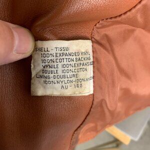 This vintage 70s Faux Leather Jacket in Camel Cognac Brown Vinyl is a stylish and versatile piece for any man's wardrobe. The shirt jacket style with a pointed collar, button closure, and lined interior makes it suitable for various occasions from casual outings to parties. With a retro 70s theme and hints of disco, mod, and rockabilly, this jacket adds a touch of nostalgia to any outfit. Made from lightweight faux leather that is water and wind-resistant, this jacket is a practical yet fashionable choice for all seasons. Perfect for a man who appreciates classic style with a retro modern twist.
