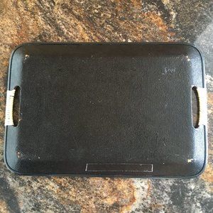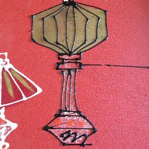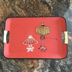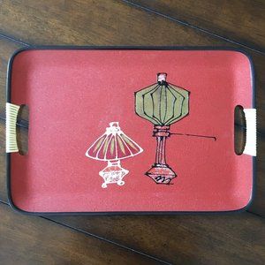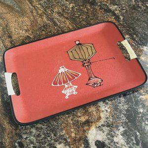 Good preowned vintage condition, reddish-orange fiberware serving tray from the 60s or 70s featuring Chinese lanterns. Rim is black and handles care wrapped in off-white fibers. Perfect for serving ethnic pastries or sushi platters. There is some wear on the bottom, but the rest of it in good overall shape given its age (please see photos for wear).