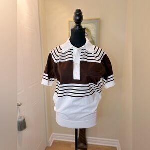 Vintage 70’s Golf Shirt 👕, buttoned, brown/white/tan stripe, short sleeve, top left pocket.