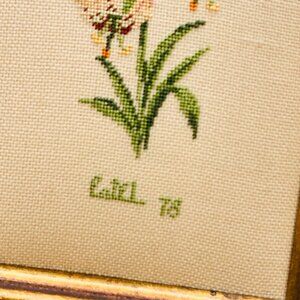 Vintage 70s Hand-stitched Needlepoint Petit Point Flower Botanical Wall Hanging