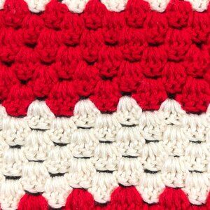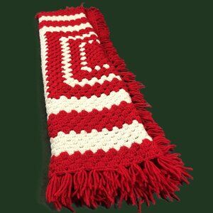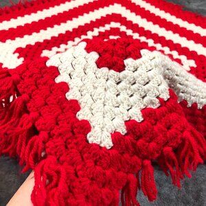 Vintage 70s Handstitched Red Off-White Square Crochet Afghan Throw Blanket