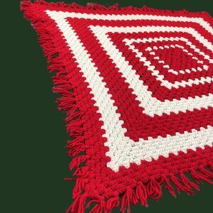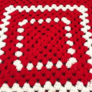 Vintage 70s Handstitched Red Off-White Square Crochet Afghan Blanket: 37"x 37"