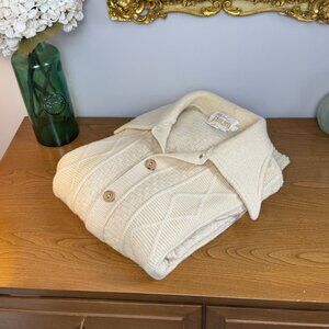 Classic vintage Jantzen wool sweater in a cream ivory tone with a button-up front with natural wood-tone buttons, diamond cable knit and textured stitching, ribbed cuffs/hem, and a wide 70s-style collar.