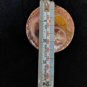 Vintage* 70s Jules Perrier Handmade Enamel Pendant with lovely brown, bronze/butterscotch swirl design on copper. Signed Jules Perrier Quebec on back. Earrings do not make up a matched set but includes the same colours in abstract on metal. 2-sided design. Does look great paired with the pendant
