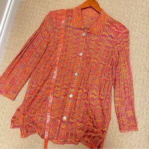 Retro and vibrant, this vintage 70s-inspired knit top features a chevron-style openwork pattern in a bold orange, pink, and yellow color mix. Lightweight and breathable with subtle shoulder pads for structure, it’s the perfect layering piece or standout top on its own.
