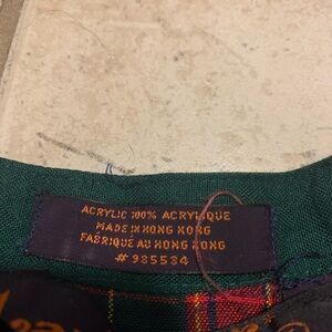The blouse features a beautiful tartan or plaid pattern in a striking color combination of red, green, and navy blue. Made from 100% acrylic, the fabric has a soft, sweater-like feel, offering warmth without being too heavy. The design is a pullover style with a half-button placket and a mandarin-style collar. The single breast pocket and elasticized wrist cuffs are classic details that add to its timeless appeal. The tag indicates it was made in Hong Kong, a common origin for high-quality vintage clothing from the mid-to-late 20th century.