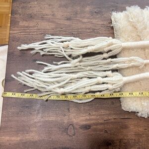 Authentic 1970s latch hook wall hanging featuring a plush cream shag background with a radiating sunburst design. The piece flows into macramé-style knotted cords, accented with natural wood beads in light and dark tones, and finished with long fringe tassels.
