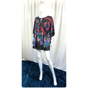 Vintage 1970’s ‘Ms Tops of California Inc’ Floral Butterfly Kaftan Cape Blouse in Black Blue Purple + Red • Scoop Neck • Psychedelic • M/L