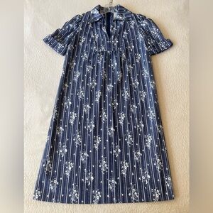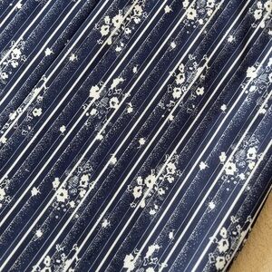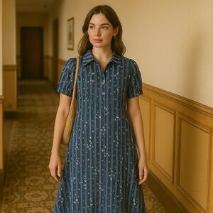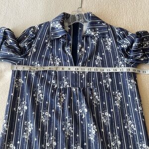Vintage Navy Floral Stripe A-Line Dress with Puff Sleeves – 1970s This stunning vintage dress features a crisp navy background with vertical white stripes and delicate white floral accents. The structured puff sleeves, wide collar, and empire waist create a distinctly 1970s silhouette. The A-line shape and crisp fabric give it a timeless, tailored appeal. Zips at the back with a hook-and-eye closure at the collar. Era: 1970s No size tag. Likely best fits size S-M. See flat lay measurements in photos to verify fit. No fabric tag. Likely polyester blend based on texture & construction Colour: Navy, white Structured puff sleeves Wide pointed collar Split neckline Invisible zipper back with hook-and-eye closure A-line silhouette Unlined Condition: Excellent vintage condition with functioning zipper & no evident flaws May be minor wear I’ve missed though item inspected with care. Colours may differ from screen to screen. Smoke free pet friendly home. New to Posh? Use code SCENEONTV to sign up & get $15 off your first purchase! Follow me on IG @mama_laurelle Cover/model photo(s) is for style inspo only, made with photos of item for sale & AI. It may or may not accurately represent item for sale. Please read the entire description & view all photos of actual item for sale. With purchasing this item, you agree to these terms Style Tags: mod floral stripe, vintage secretary dress, retro 70s daywear