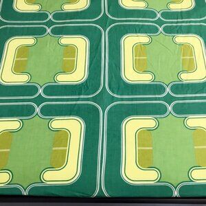 1970s Op art Geometric Groovy Bed Cover with two matching pillow shams. There is a seam down centre of cover with darts at corners and gathered with elastic. The Pillow shams have piped edges and metal zippers but no insert. Colours are kelly, lime and chartreuse greens with white and yellow and fabric is a heavy cotton/polyester with a light canvas feel. Full or double size - see measurements below.