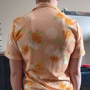 Vintage 70s Peach Floral Blouse Short Sleeve Button-Up