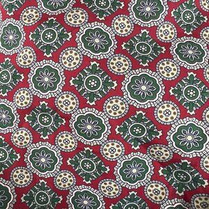 This charming vintage blouse boasts a vibrant micro floral geometric pattern in shades of red, green, & white. It features a sophisticated pussy-bow neckline, adding a touch of classic elegance, alongside long sleeves with buttoned cuffs. Perfect for adding a distinctive, timeless flair to any outfit, this piece is a true vintage gem for those who appreciate unique fashion. Likely from the 1970s or 1980s.