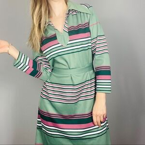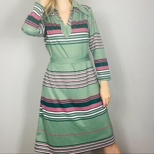 Vintage 70s Stripe Green Dagger Collar Midi spring summer Dress retro