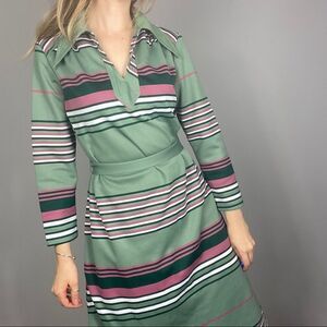 Vintage 70s dagger collar green stripe dress tie waist zipper back v neck long sleeve.