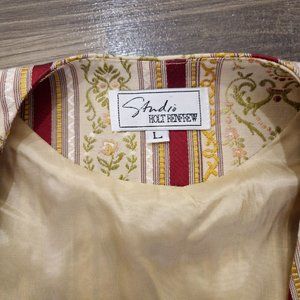 The multicolored brocade fabric is embellished with a classic monochrome pattern, perfect for a party or cocktail party. A button closure adds sophistication to the vest, while the cotton outer shell material exudes romantic cottage style. The retro style and colorful design make it a must-have for those who love bohemian, London or Parisian style. This piece is sure to add a touch of classic charm to any outfit.
