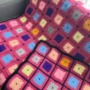 Stunning vintage granny square throw. Pink, dark blue, yellow and orange colors will make an impact in any decor. Likely acrylic knit.