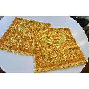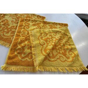 Vintage 70s bath towels set, orange yellow arabesque print, reversible, fringed