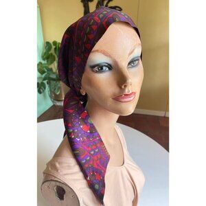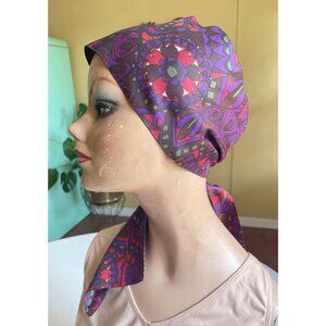 Vintage 70s boho head scarf, purple, hot pink abstract, long silky headwrap
