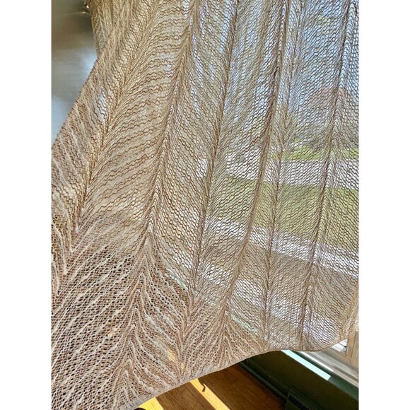 Stunning open weave mesh, in cream, tan, oatmeal colors, with horizontal wavy stripes in an ombre effect, perfect drape for a boho basement or bedroom.