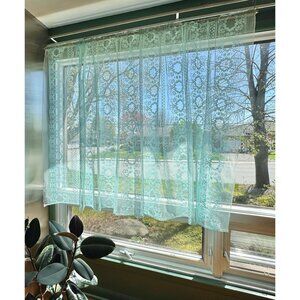 Vintage 70s curtain, light blue floral mesh, sheer, rod heading