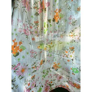 Vintage 70s curtain, pink and orange flowers, white background, semi-sheer