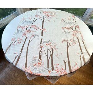 Vintage 70s curtain, red, brown trees, forest pattern, off-white background