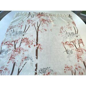 Red, grey and brown forest and trees pattern, sheer. Label has been cut, so unknown material but likely polyester. It is lightweight and in very good condition, only noted issue is a hole about the size of a fingertip. Not very visible once hung, please see pictures for accuracy.