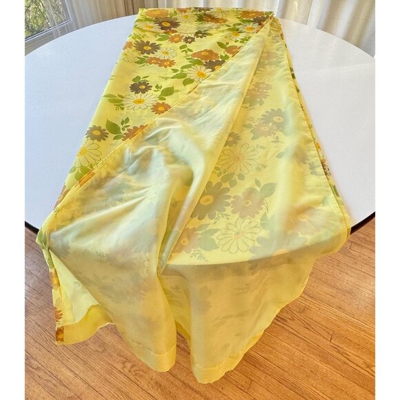 Vintage 70s curtain, sheer yellow orange floral, ruffled top, single panel
