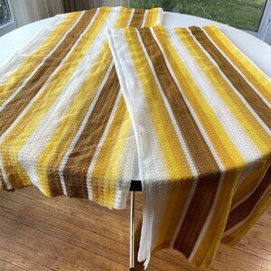 Very 70s colors, yellow, orange and white, vertical stripes. Really stunning! Would be perfect in any room or a basement. The top of the panels have a ruffle, each come with a tieback.