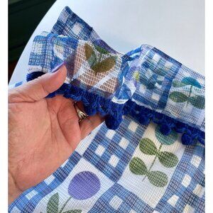 From the 70s, they likely are a synthetic blend, sheer woven material with a pompoms ruffle trim at the top. Colors are indigo blue, green, purple and white.