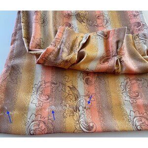Some areas have thinning, some have a bit of fading, mostly on the sides. The bottom hem has the most wear, with thinning and a few tiny holes, please see pictures for accuracy. The side hems are fraying a little on the inside part, not showing once hung.