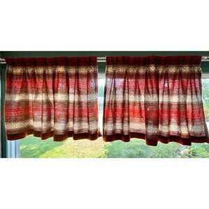 Vintage 70s curtains, brick red, brown, beige striped panel, pleated, pair