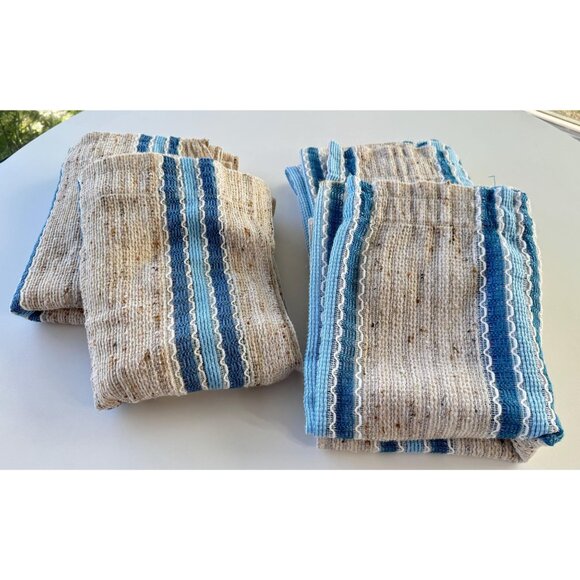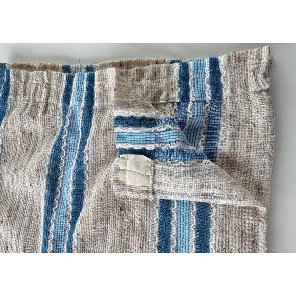 Vintage 70s curtains, oatmeal, white, blue stripes, geometric pattern, as a pair
