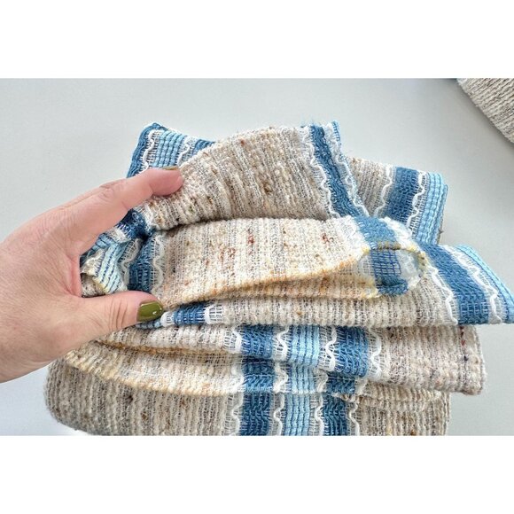 Woven mesh, blue, white, tan vertical stripes with a geometric touch. They have a label but it is totally faded so unknown material or maker.