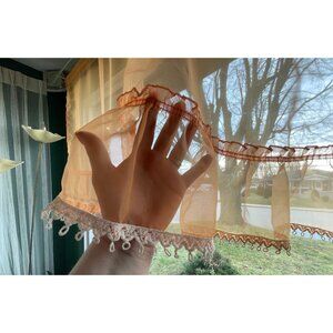 Vintage 70s curtains, orange sheer ruffled panels with cream lace, as a pair
