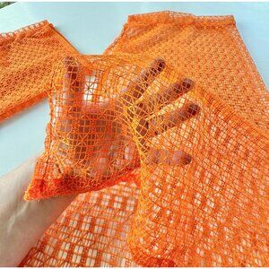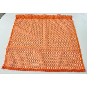 Vintage 70s curtains pair, bright orange mesh panels, open weave