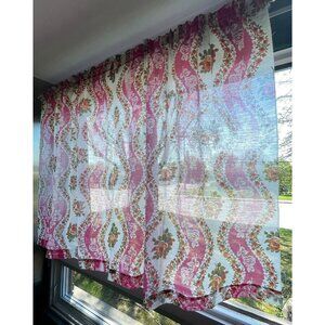 Vintage 70s curtains, white, hot pink striped, sheer floral panels, pair