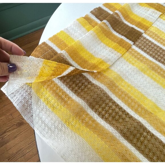 Very 70s colors, yellow, orange and white, vertical stripes. Really stunning! Would be perfect in any room or a basement. The top of the panels have a ruffle, each come with a tieback.