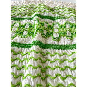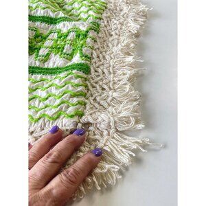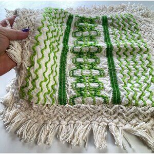 Stunning vintage cushion cover, crocheted trim. Different shades of green, from avocado to lime with a cream background and trim.