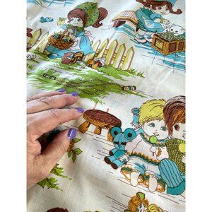 Vintage 70s double curtains, juvenile print, ruffled panels, gender neutral room