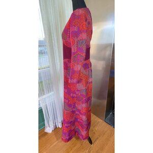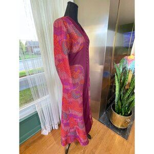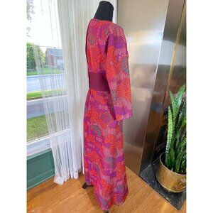Stunning 1970s long sheath dress, in bold abstract pattern. V neck with decorative buttons on the front, it has long sleeves and bold magenta, hot pink, orange, purple patterns. Just above ankle length, zips on the back. Made in Canada by Young Elegant. Perfect casual chic or business casual dress.