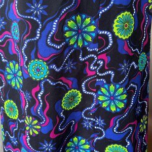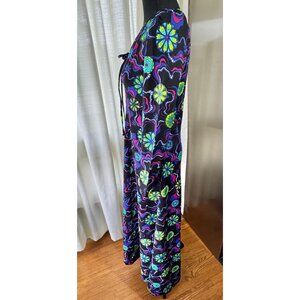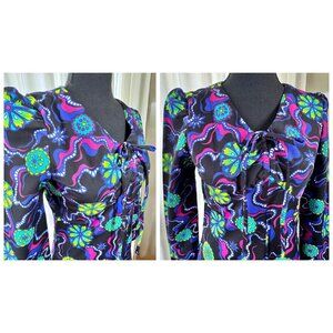 Fabulous 1970 maxi dress. What makes it so iconic is the grooviest print of abstract floral, in purple, teal, blue, lime green, hot pink over back background. It has puffed shoulders and long sleeves, the neckline is low with a drawstring ribbon bow. The dress is below the ankle, and zips from the back.