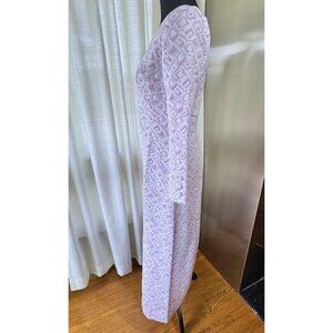 Gorgeous 1970 maxi dress, in a lavender textured geometric print. It has an empire waist with a V neckline and long sleeves. The gown is an A-Line silhouette, ankle-length and zips from the back.