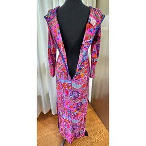 Fabulous 1970 maxi dress, with long sleeves. It has an asian-inspired novelty print, with dragons, blossoms and floral, in bold seventies colors: magenta, fuchsia, turquoise, orange, red. The dress is ankle length; it has a deep V neckline gathered to a keyhole detail at the empire waist. It zips from the back. Made in Canada by Fancy That.