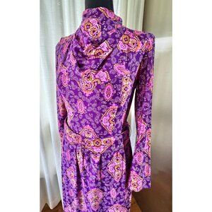 Awesome 1970 maxi dress, long sleeves, has an abstract paisley in a diamond pattern in bold seventies colors: purple, pink, and mustard yellow. It has an assorted belt with three buttons, a high neck cowl collar and the dress is ankle length. The bottom has a wide ruffled flounce, giving out a slight mermaid-inspired silhouette.
