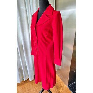 it has princess seams to emphasize the fitted silhouette, long cuffed sleeves. It opens down to below the waist. Length is just below the knee.